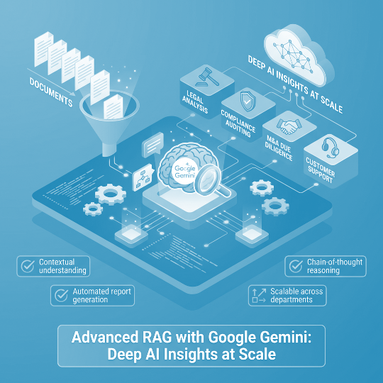 For enterprises handling complex document workflows at massive scale, we offer a supercharged RAG solution powered by Google Gemini’s multimodal and reasoning capabilities. This advanced system doesn’t just search — it understands, analyzes, and automates decisions across thousands of documents with high accuracy.