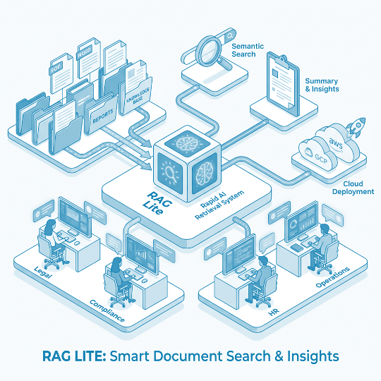 We deploy a lightweight, high-performance Retrieval-Augmented Generation (RAG) system designed to search, extract, and summarize insights from hundreds to thousands of documents — including PDFs, Word files, internal reports, and knowledge bases. Optimized for speed and relevance, this solution empowers teams with real-time access to institutional knowledge.